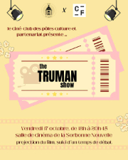 Le BDE La So’ et CINE FAC vous propose une projection du film The Truman Show de Peter Weir, avec Jim Carrey, Laura Linney, Natascha McElhone & Ed Harris, en VOSTF, suivie d’un débat.